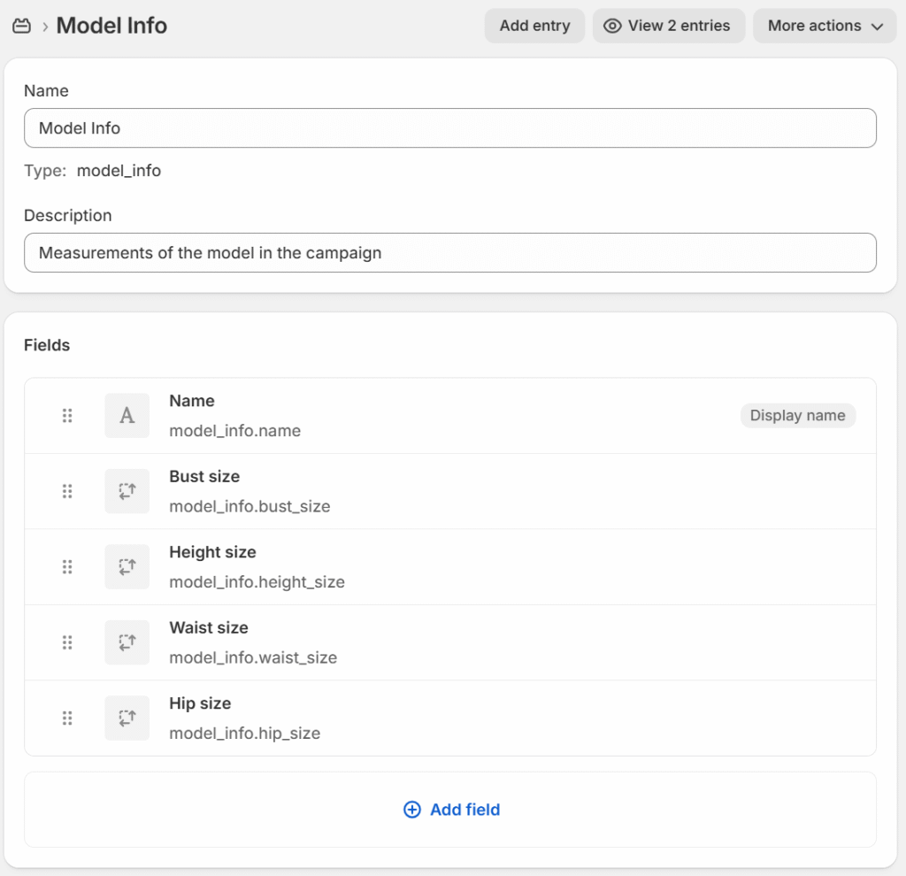 まず、Admin > Settings > Custom data > Metaobjects にて、「Model Info」という名前のメタオブジェクト定義を作成しました。