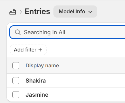 定義が完了するとContent > Metaobjects メニューが表示され、ここから各モデルさん情報を入力できます。