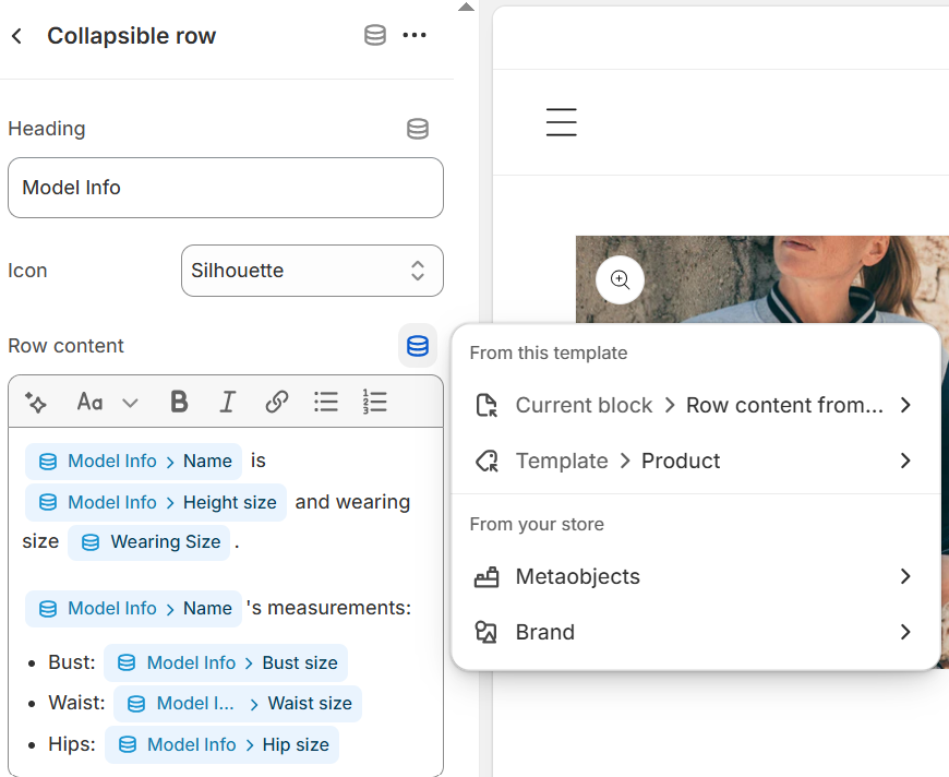 ブロック内のテキストエリア (Row content)には、動的なメタフィールドとメタオブジェクトの値を差し込みます: