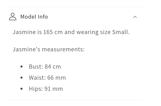 モデル着用画像がある商品の詳細ページに、以下のようなモデル情報を表示できるようにしました: