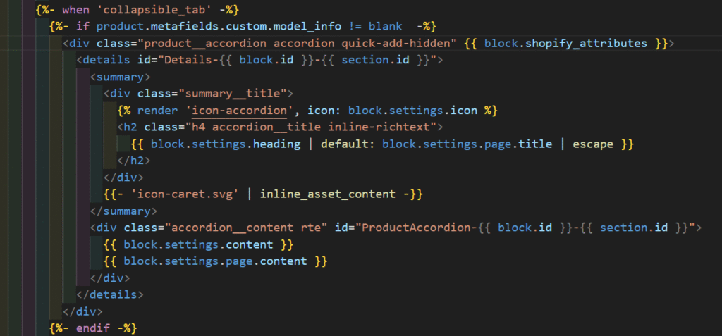 モデル情報が未入力の商品の場合は、該当のブロックを表示しないようLiquidファイル内に条件分岐を追加しました:
