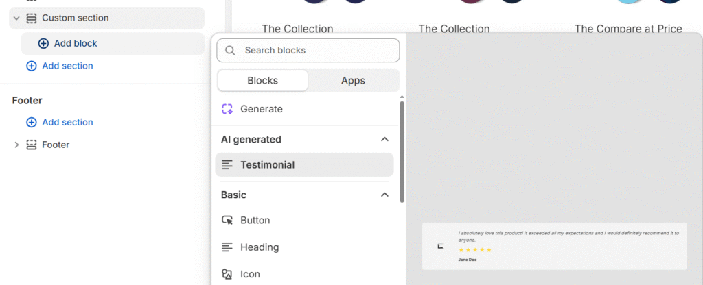 試しにShopifyの公式ドキュメントに記載されている以下のプロンプトを使って、ブロックを生成してみましたのでその手順を紹介します。