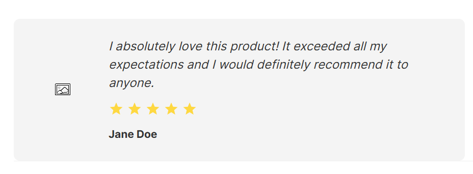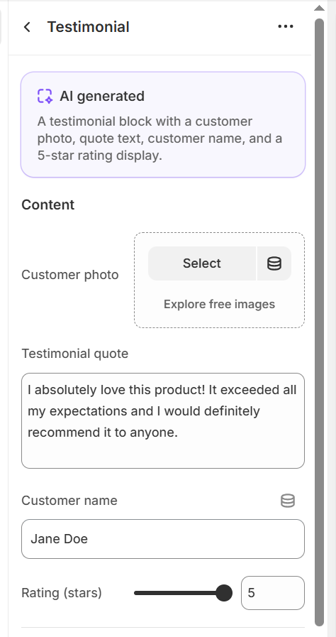 そのため、”A testimonial block with a customer photo, quote text, customer name, and a 5-star rating display.” というプロンプトに基づいて生成されたもので、指定された要素をすべて実現していると言えます。