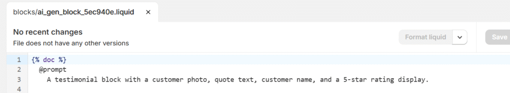生成されたブロックのコードは、テーマの/sections/blocksフォルダ内に保存されており、ファイル名はai_から始まります。ファイルを開くと使用されたプロンプト内容がコメントで記録されており、再利用や参考にも便利です。
